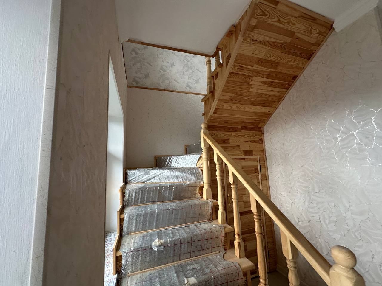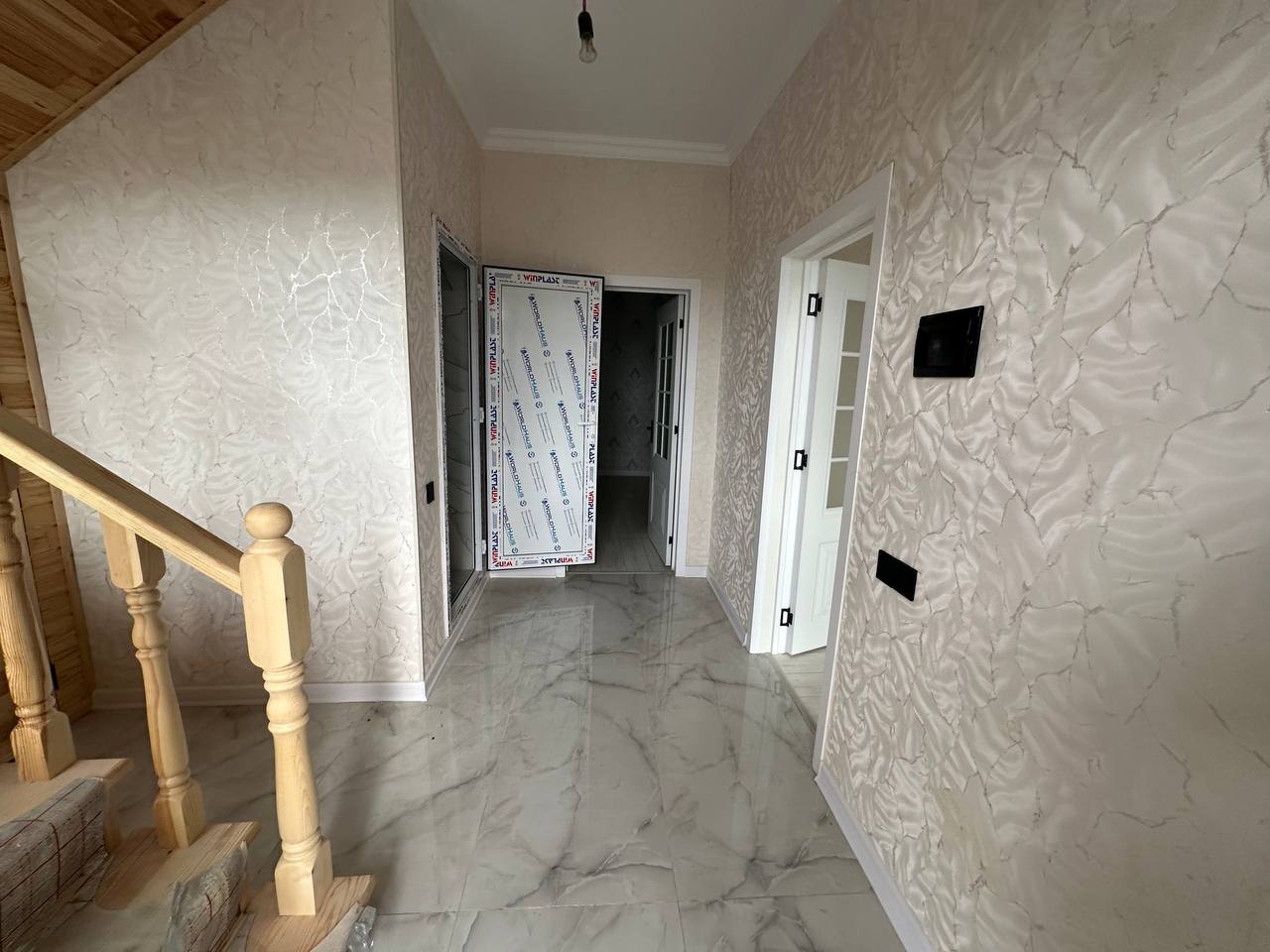 - Döşəmələr və divarlar: Zal və dəhlizdə mermer tipli kafel, otaqlarda taxta fakturalı laminat. Divarlarda dekorativ suvaq və alçı işləri, tavanlarda spot işıqlandırma üçün yerlər.