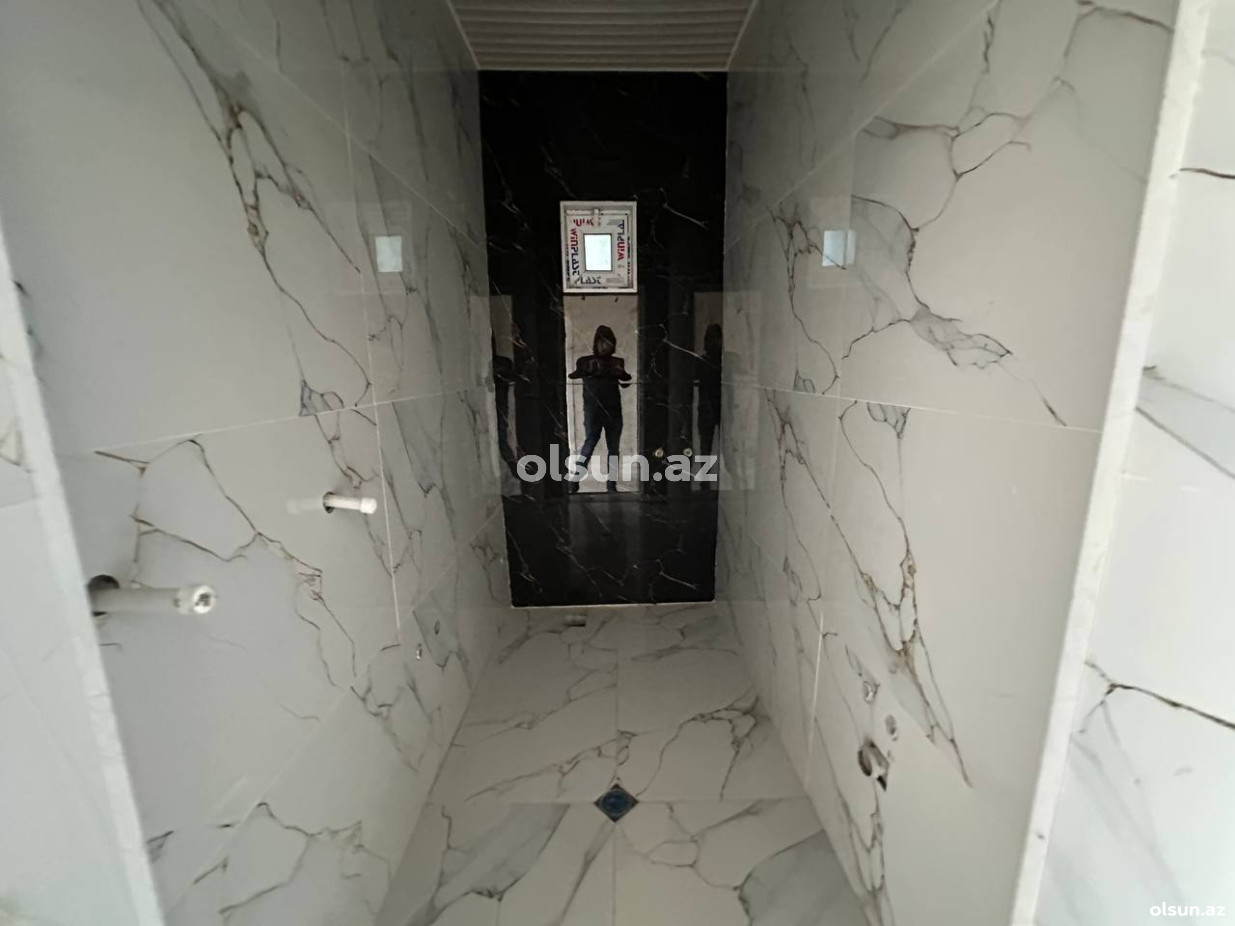 - Mətbəx: Uzunlamasına plan, pəncərəli, divarda mərmər naxışlı panel, kommunikasiya çıxışları hazır.