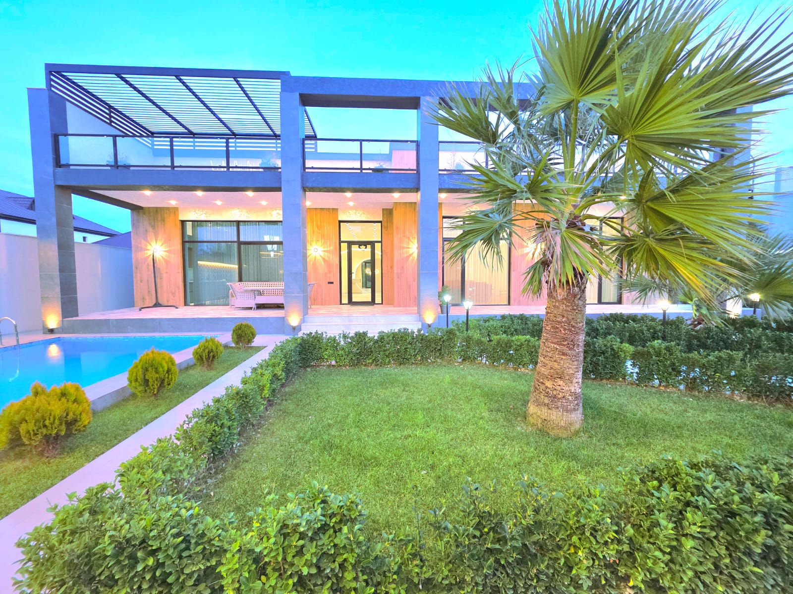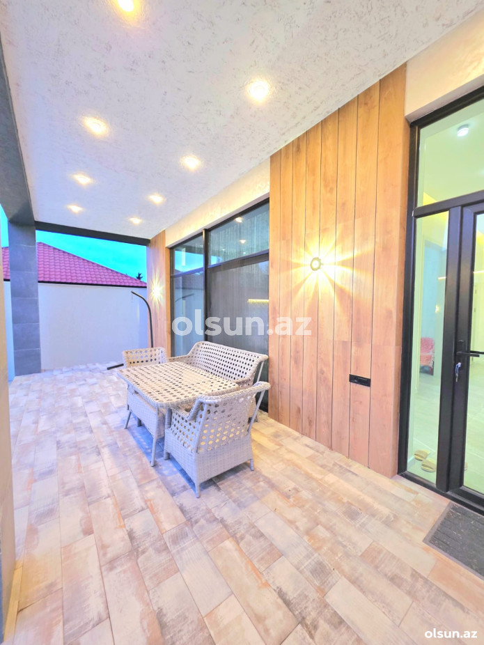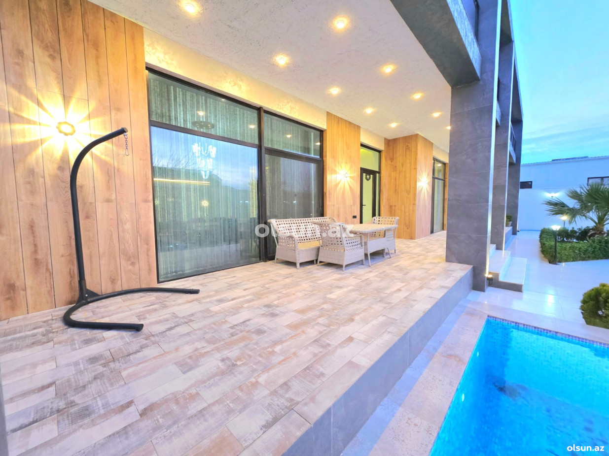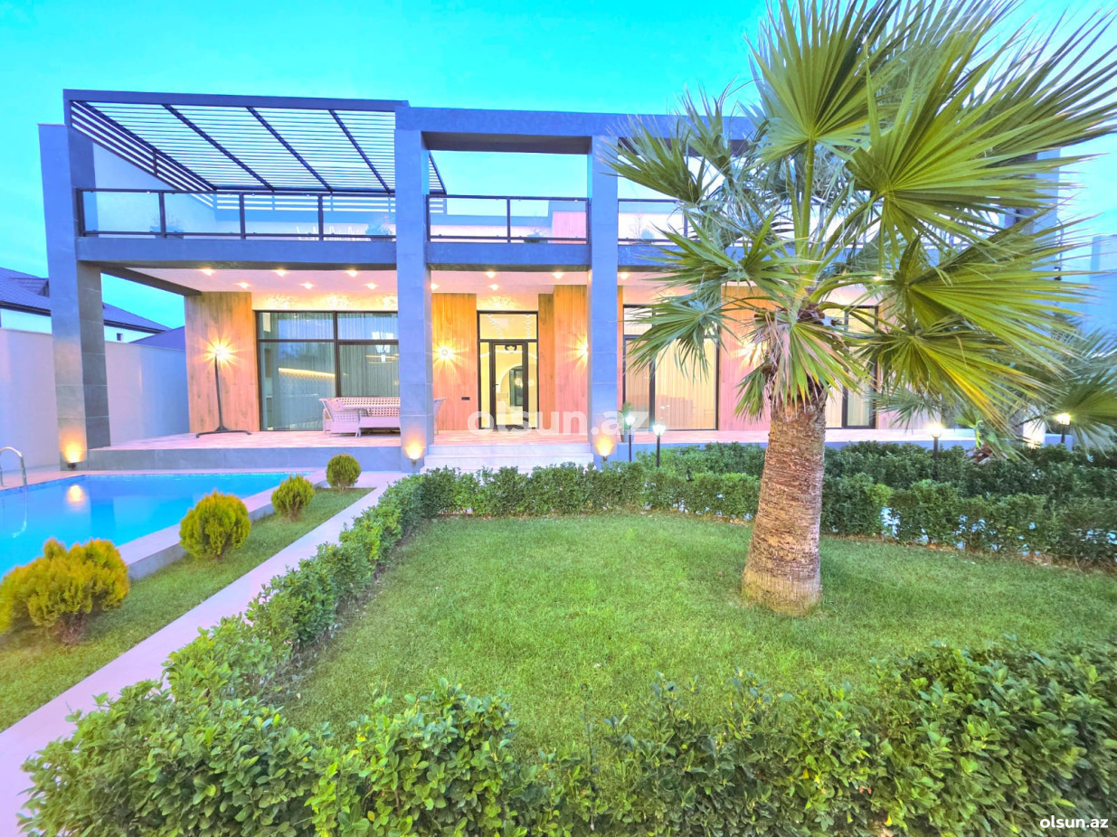 Həyətində filterli hovuz, cambalkonlu mətbəx, manqalxana, sanuzeli mövcuddur