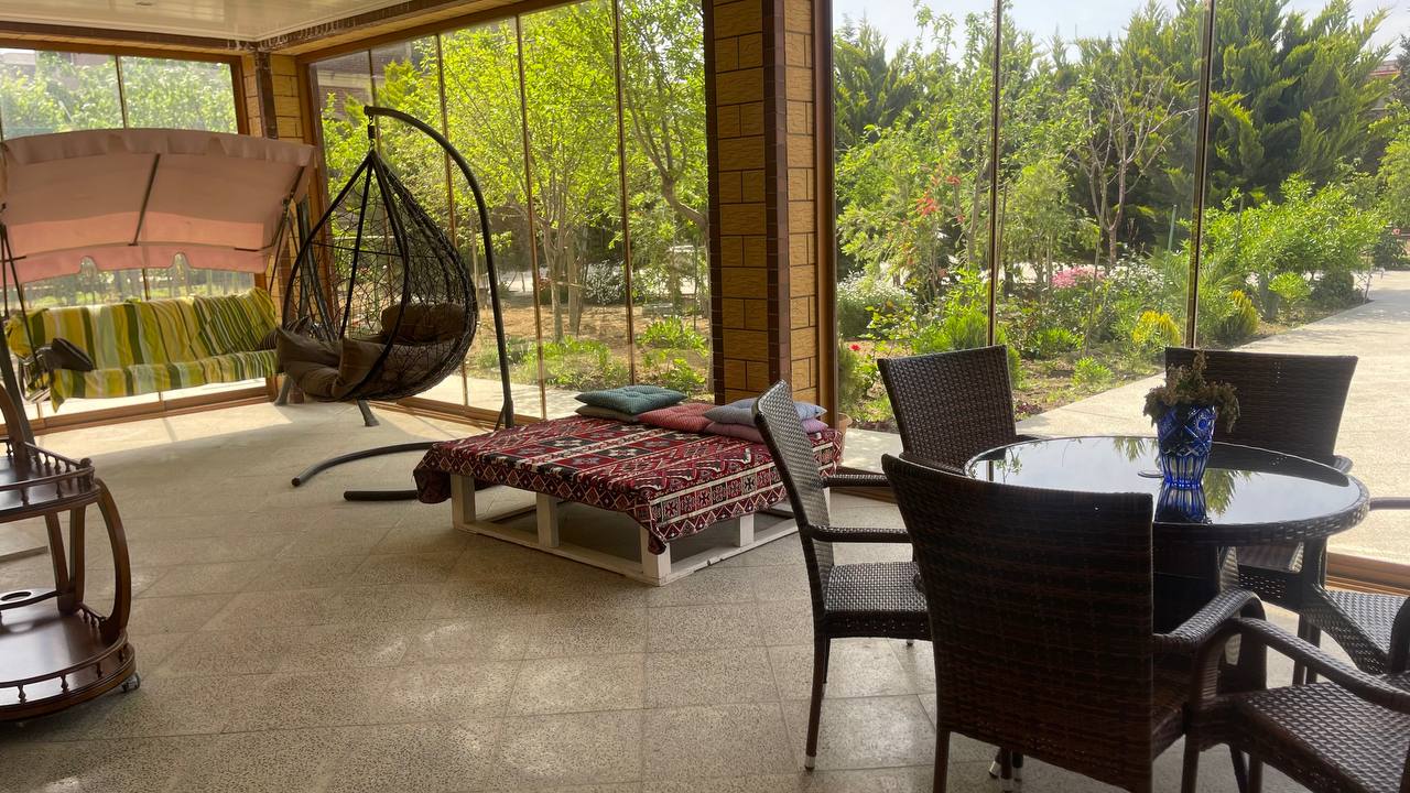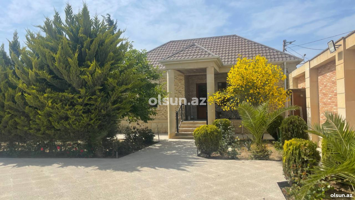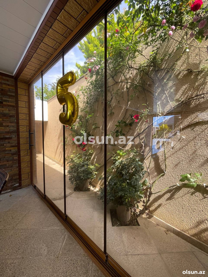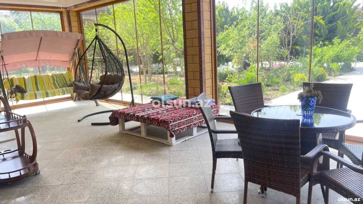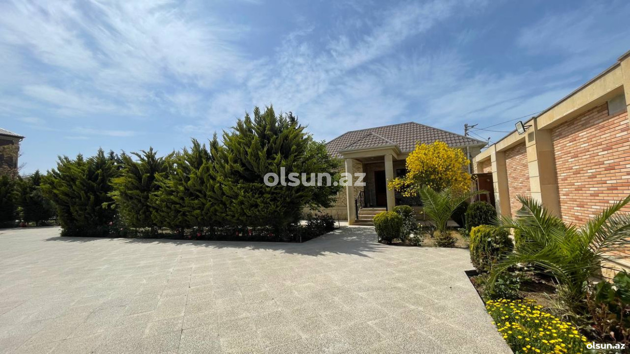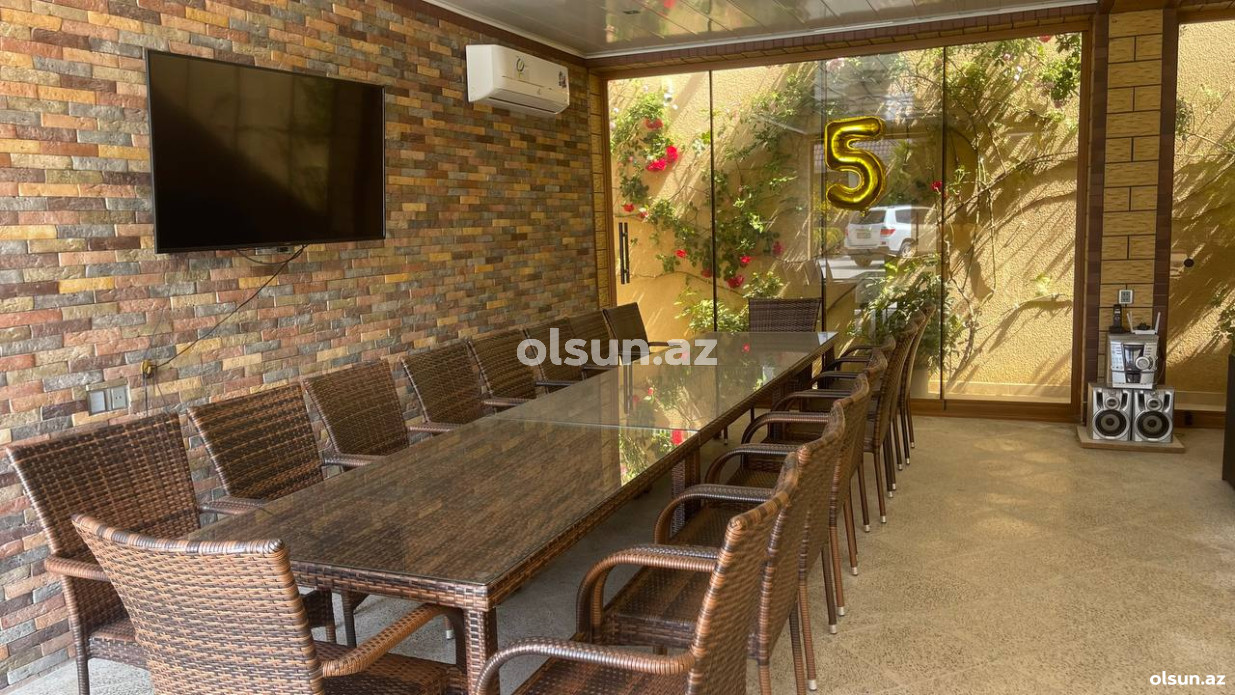 Həyətində geniş 2 paltar dəyişmə və hamamlı istilik sistemli filterli hovuz, manqalxanası, təndir, 8 nəfərlik söhbətgah (besedka), 50 nəfərə qədər qonaq üçün (açılıb bağlanan, istilik keçirməyən xüsusi şüşələrlə) yay-qış mətbəxi, qonaq, yataq, mətbəx, sanuzelli, mühafizəçi evi, qaraj, 16 kamera sistemi, kanalzasiya sistemi, pultla idarə olunan darvazası, dekorativ ağacları və gülləri, sanitar qovşağı, yaşıllıq ərazisi, sensorlu gecə işıqları var.
