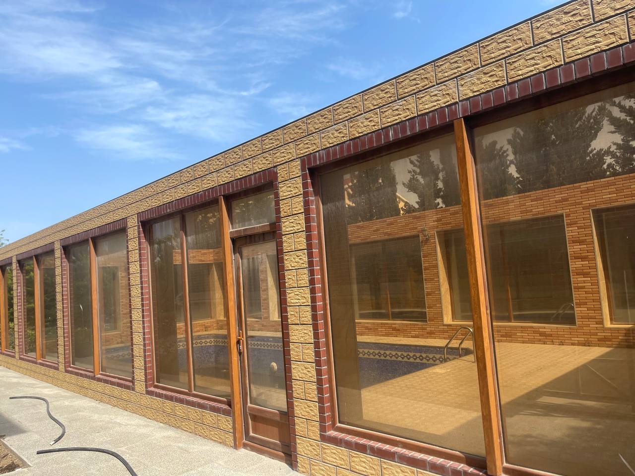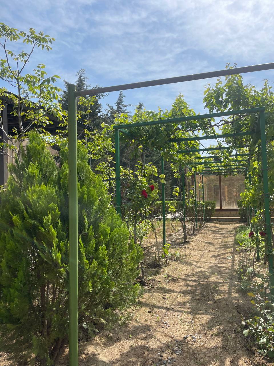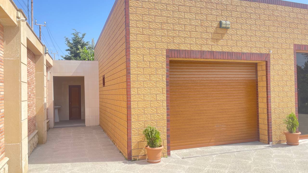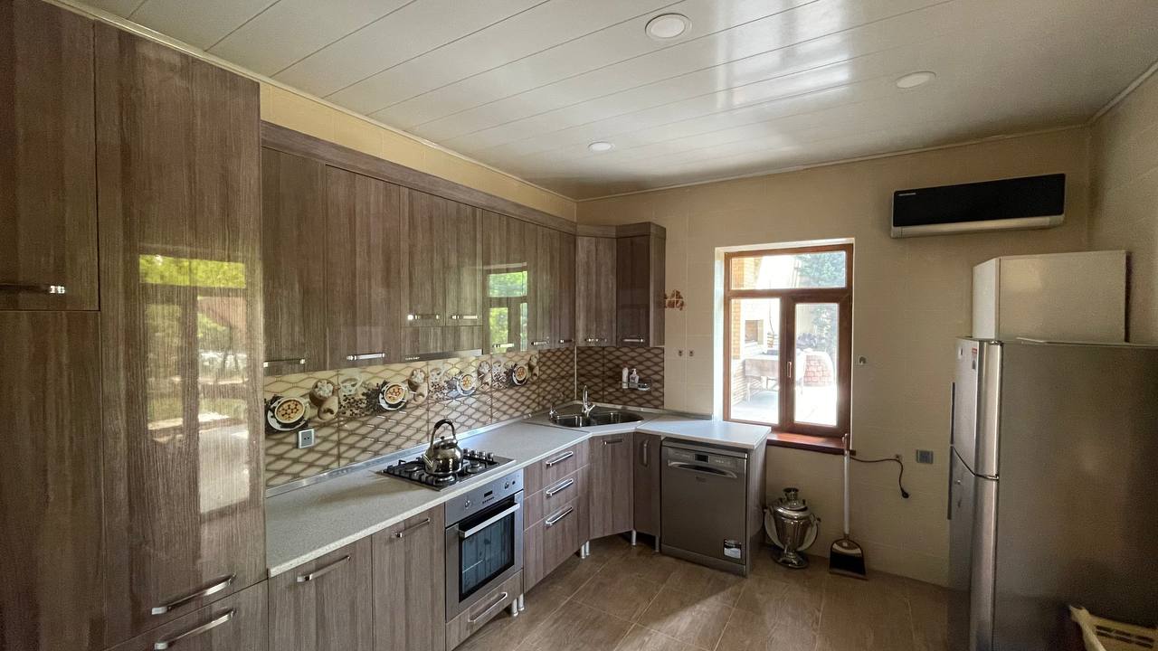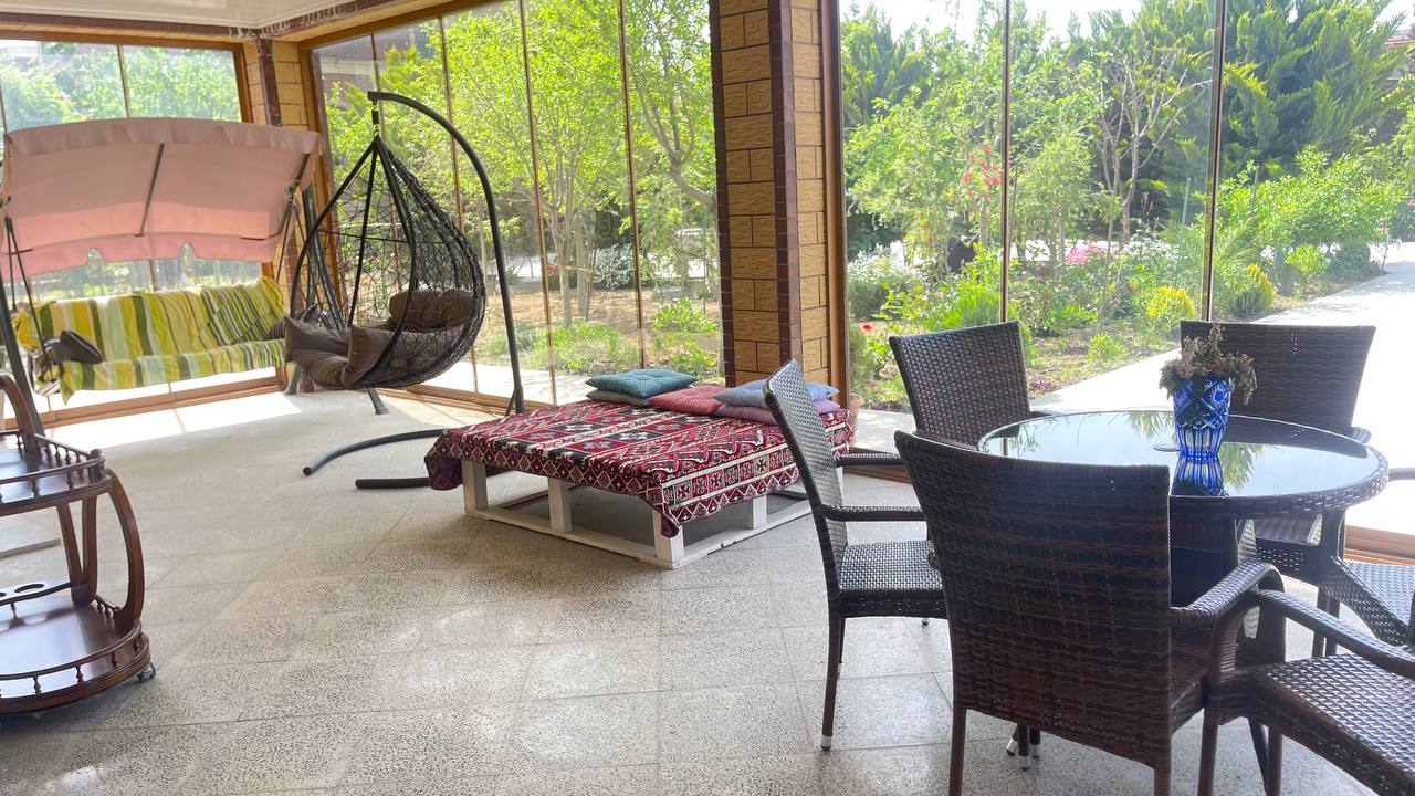 Həyətində geniş 2 paltar dəyişmə və hamamlı istilik sistemli filterli hovuz, manqalxanası, təndir, 8 nəfərlik söhbətgah (besedka), 50 nəfərə qədər qonaq üçün (açılıb bağlanan, istilik keçirməyən xüsusi şüşələrlə) yay-qış mətbəxi, qonaq, yataq, mətbəx, sanuzelli, mühafizəçi evi, qaraj, 16 kamera sistemi, kanalzasiya sistemi, pultla idarə olunan darvazası, dekorativ ağacları və gülləri, sanitar qovşağı, yaşıllıq ərazisi, sensorlu gecə işıqları var.
